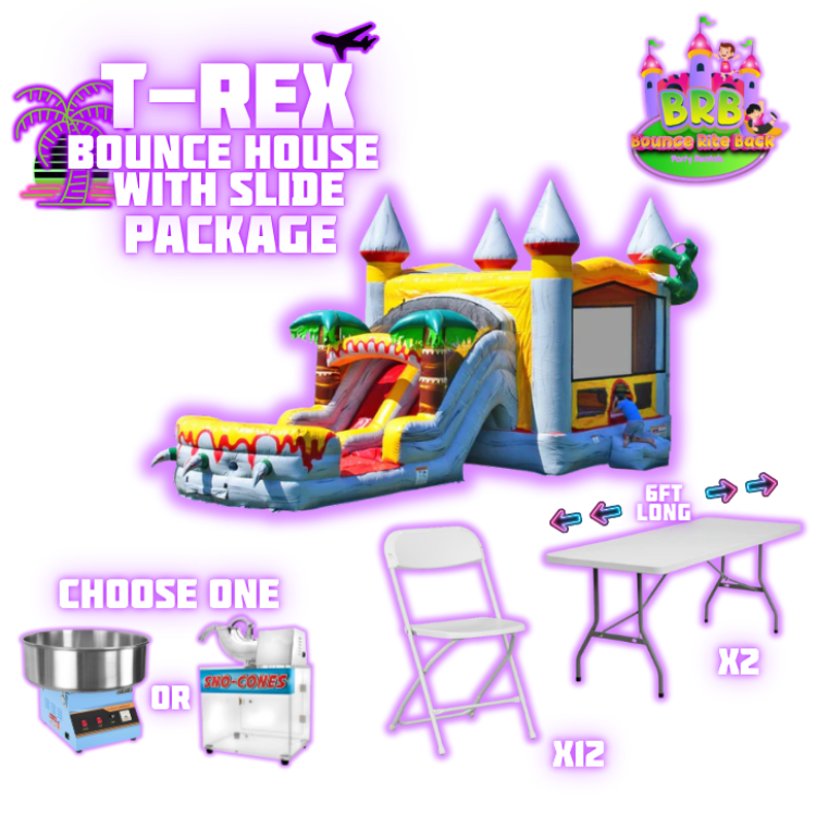 T-Rex Bounce House w/ Slide (double lane)T-Rex Bounce House w/ Slide (double lane) Package:T-Rex Bounce House w/ Slide (double lane)1Dropdown13152317_16433531100 The double lane T-Rex Bounce House Combo is the perfect choice for your Broward County bounce house rental. The best of both worlds its a bounce house and slide at the same time. Send your event back to the age of the dinosaurs with the T-Rex Combo Bounce house featuring life-like teeth and claws. Let us help you design your custom party combo bounce house rental package with this double lane combo as the centerpiece. Always clean and sanitized.