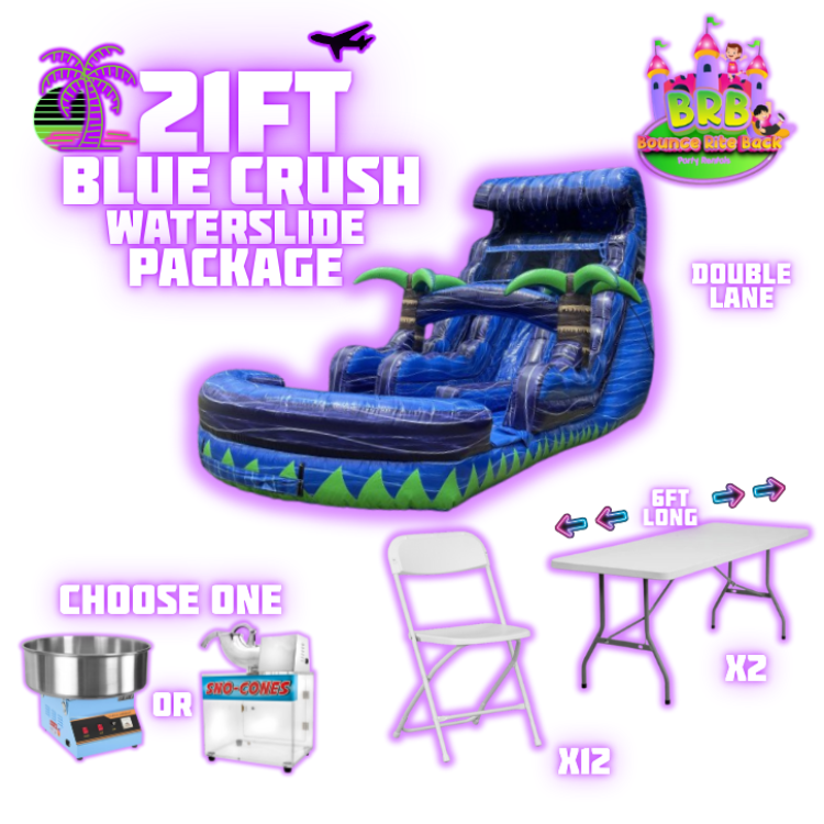 21ft Blue Crush (double lane)21ft Blue Crush (double lane) Package:21ft Blue Crush (double lane)1Dropdown13152297_16433171100 The 21Ft Blue Crush Double Lane water slide is the perfect choice for your Broward County bounce house rental. Fun for all ages this slide will send you cascading into a refreshing splash landing, creating lasting memories for your friends and family. The Blue Crush has double the lanes for double the fun, the huge pool is always great for group picture opportunities. Let us help you design your custom party water slide rental package with this 21' double lane water slide as the centerpiece. Always clean and sanitized.